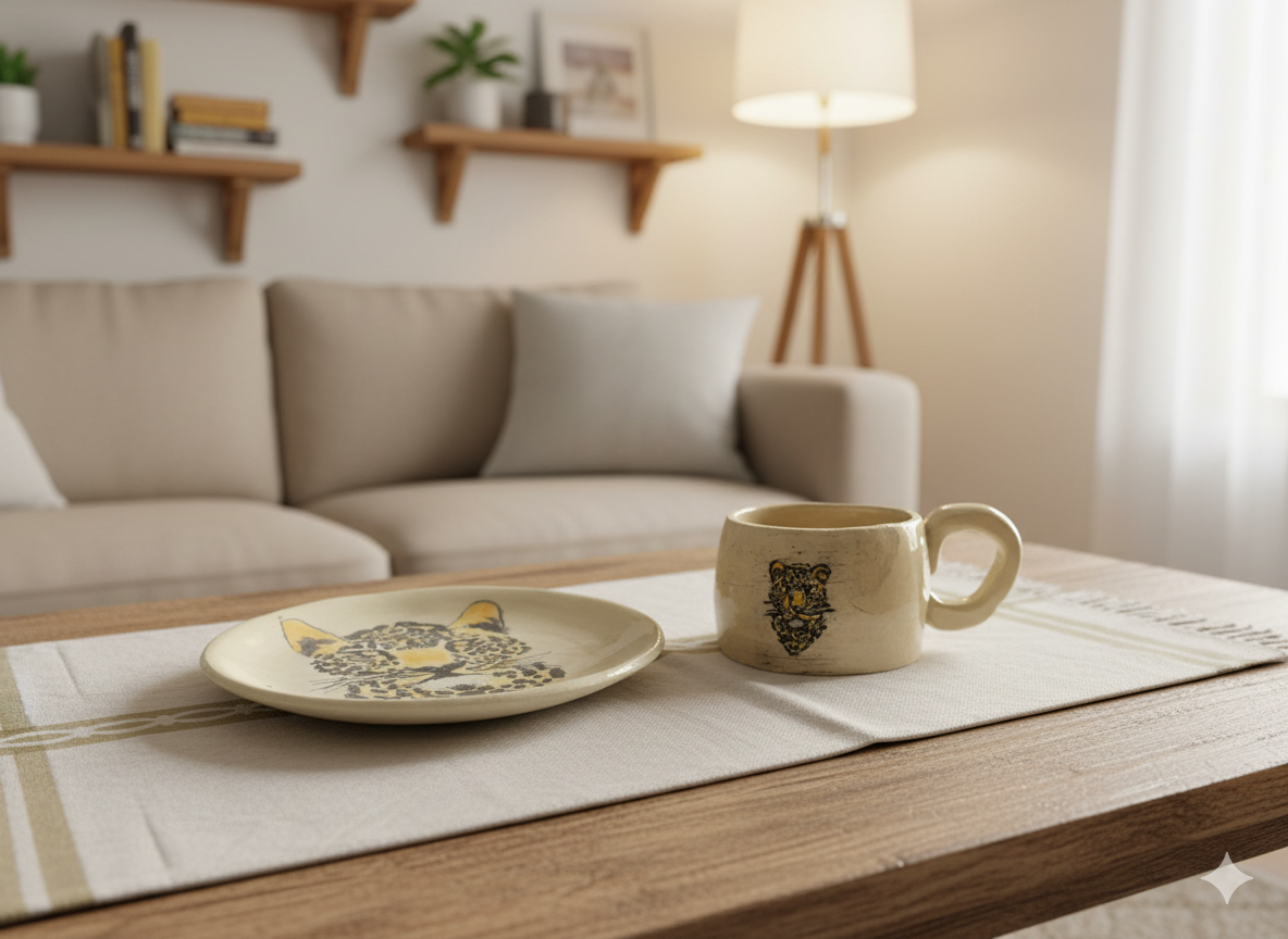 ספל ותחתית אלה, עשויים בעבודת יד מפורצלן איכותי, כוללים מוטיב של נמר, המסמל חוזק ויופי.